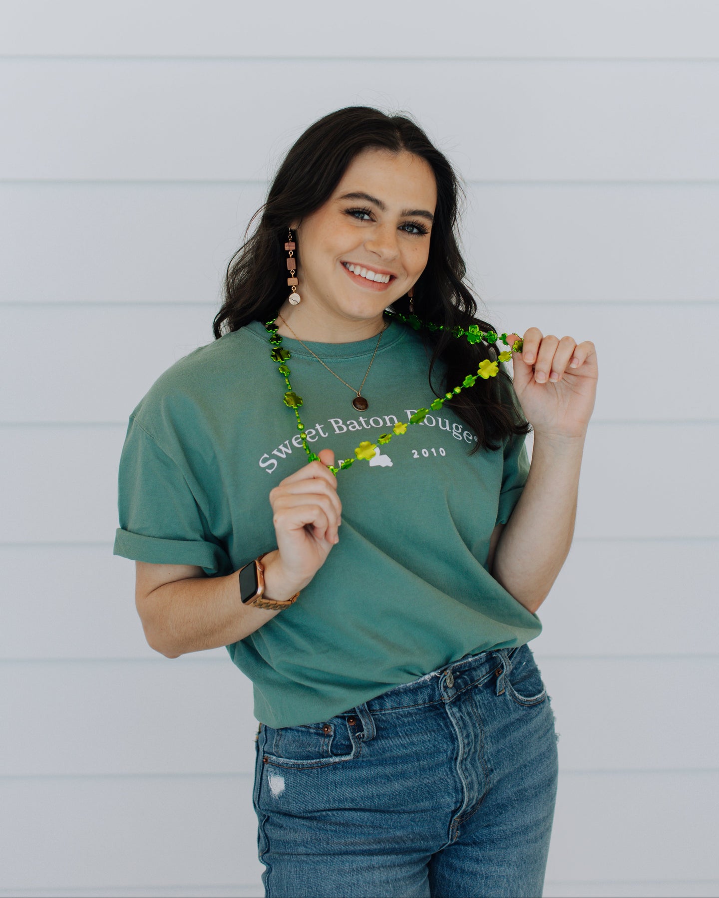 Person wearing a light green t-shirt with 'Sweet Baton Rouge' text, holding green beads for St Patricks Day, Wearin' of the green parade.