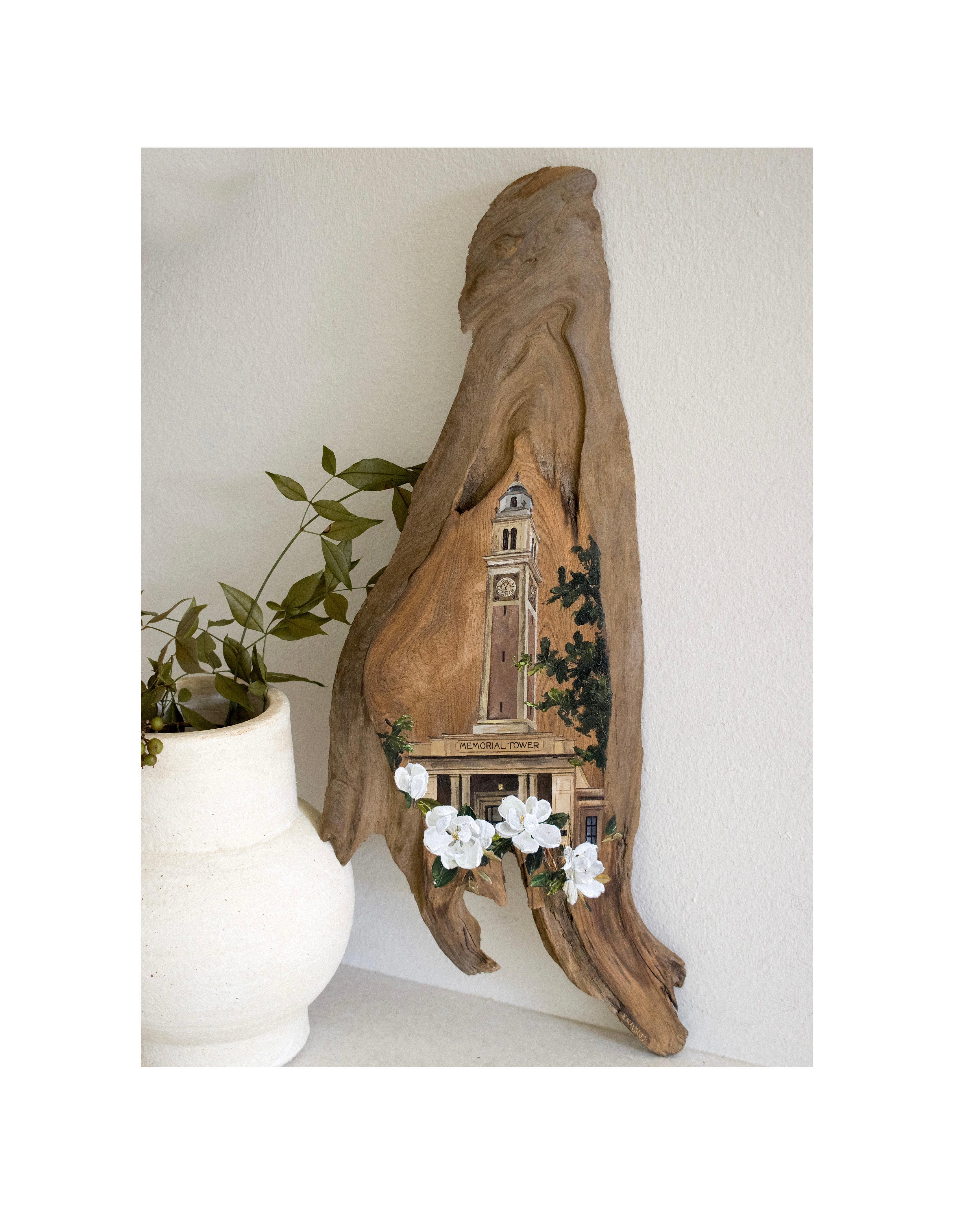 Approximately 5”X16” ORIGINAL LSU MEMORIAL TOWER painting on authentic, Louisiana cypress wood * painted with artist grade acrylics; sawtooth hanger installed on the back for easy wall installation; signed at the bottom of piece in gold