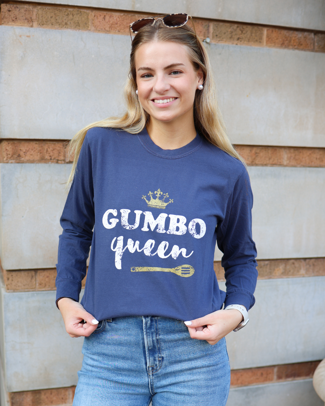 Our Gumbo Queen long sleeve is printed on a soft-washed Navy Comfort Colors t-shirt, making it the perfect cozy attire for the first cool snap of the season.
