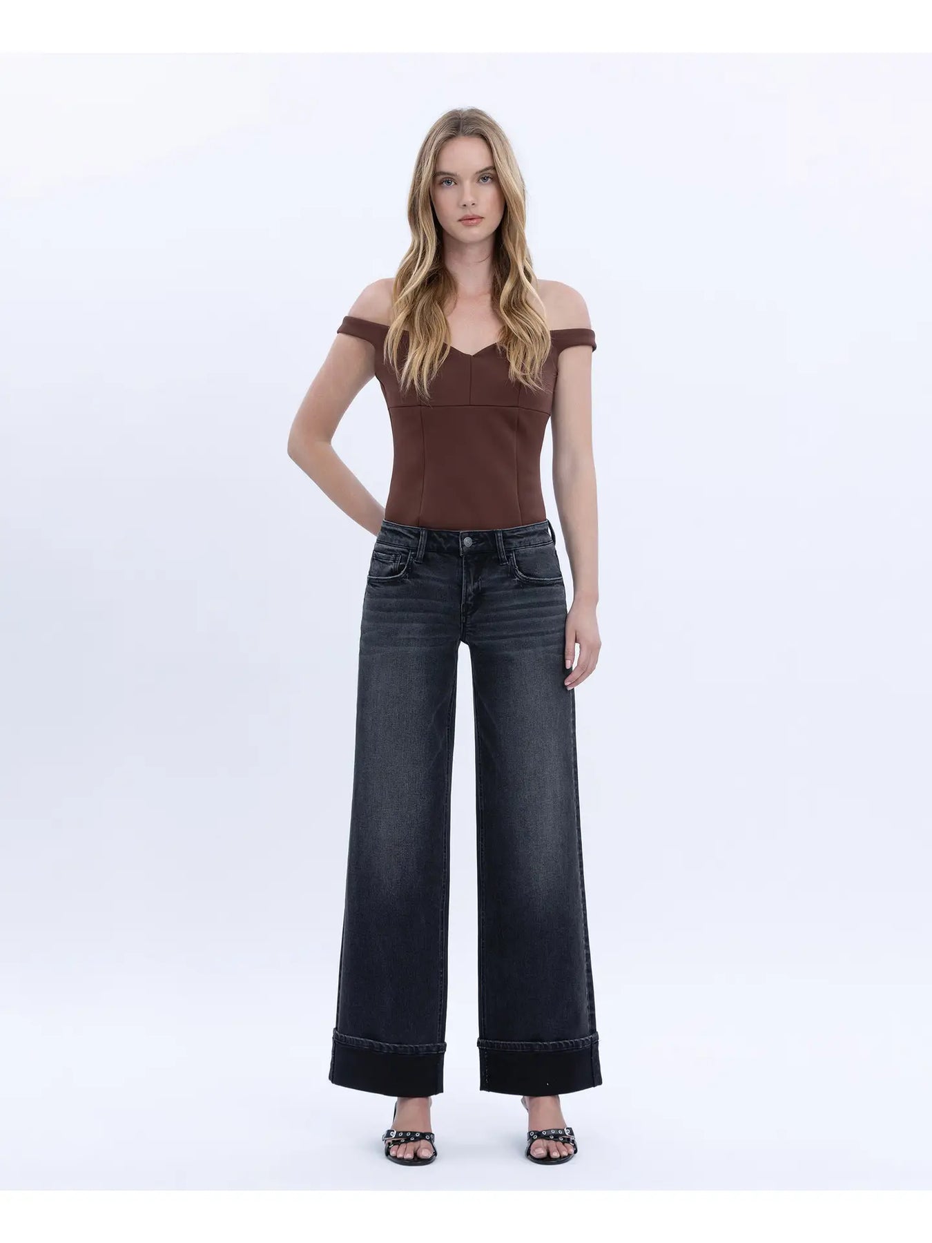 Stay on-trend with the black Low Rise Cuffed Baggy Wide Jean. This style offers a relaxed, low-slung fit with a modern cuffed hem and a bold wide leg.