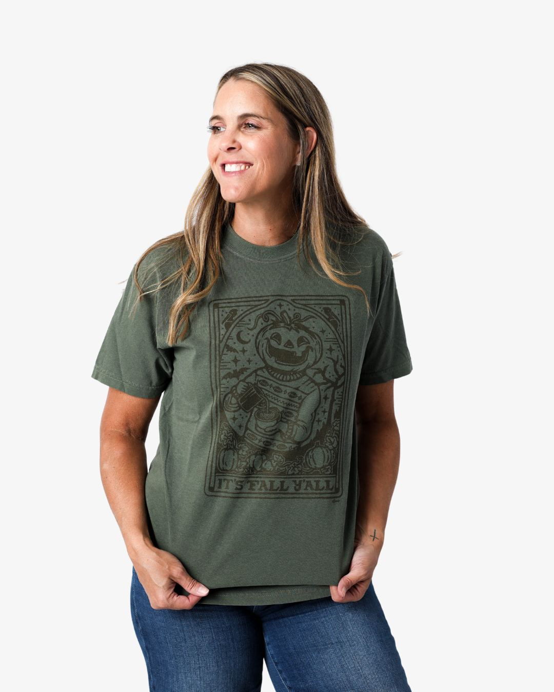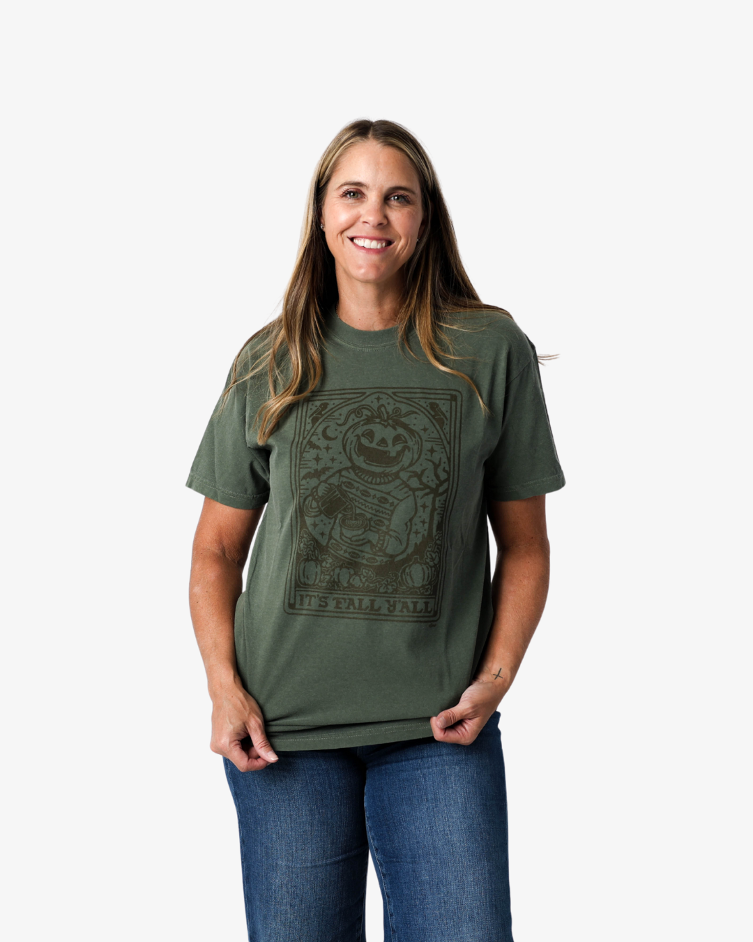 Celebrate the fall season with our "It's Fall Y'all" t-shirt! This adorable design features a pumpkin-head coffee lover enjoying a warm beverage, surrounded by autumnal elements. It's the perfect way to show your love for fall, football, and all things cozy