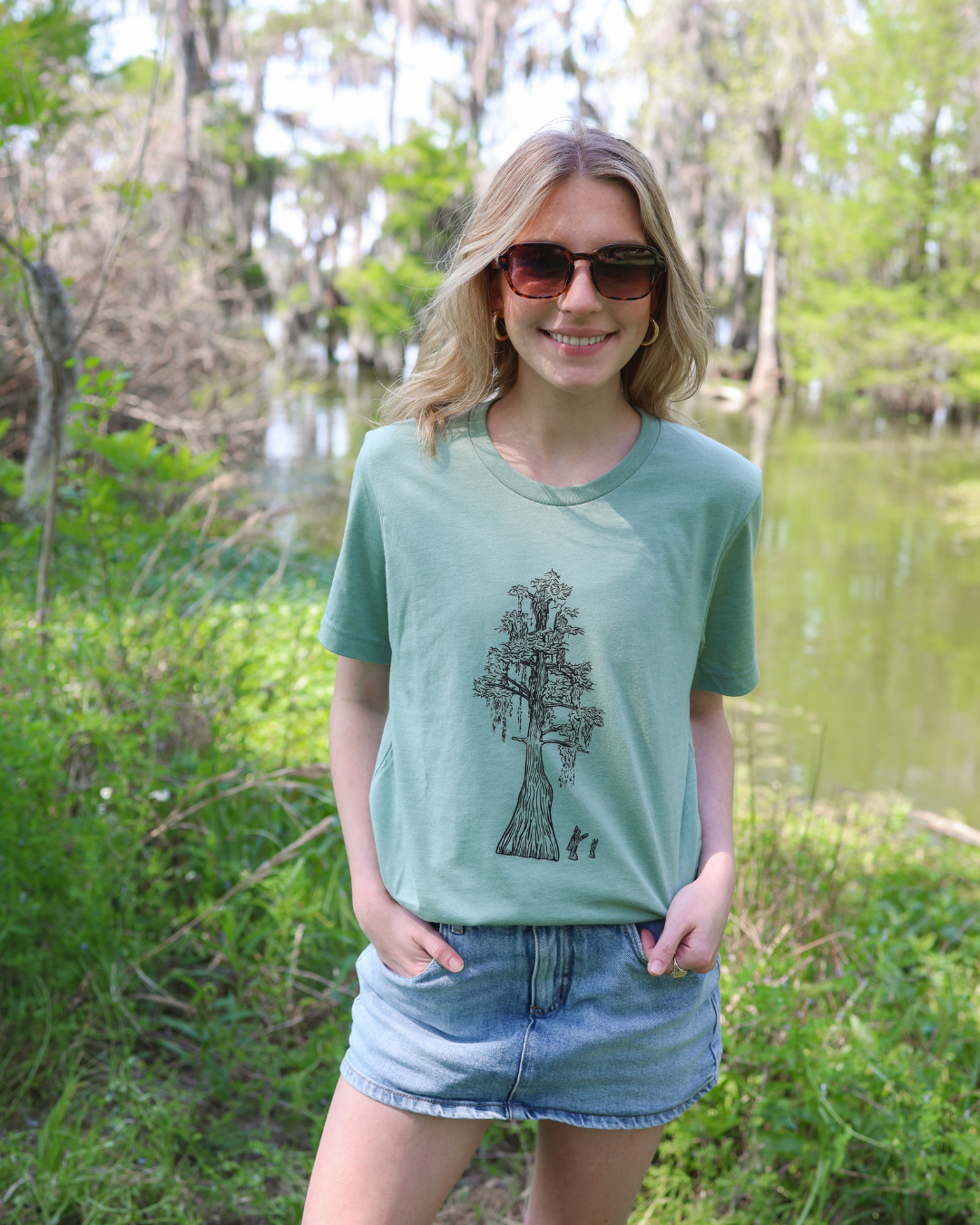 What's more Louisiana than a cypress tree? This hand sketched style design printed on a vibrant sage tee is the perfect homage to our official state tree - The Bald Cypress.