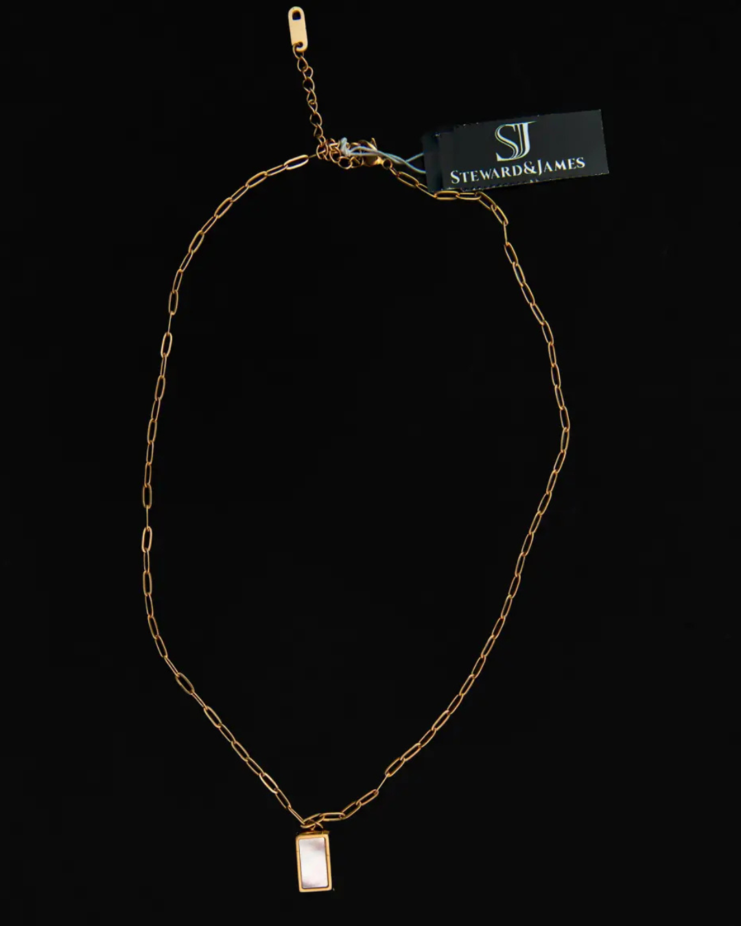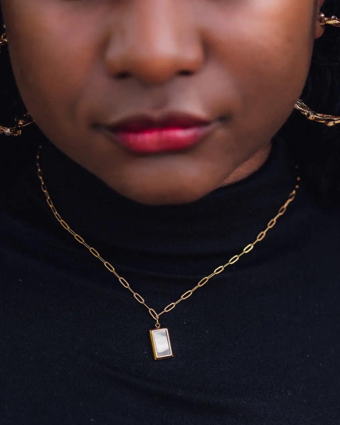 Iridescent shell is the star of the show on this necklace. The Dahlia Necklace is made from 18kt gold plated stainless steal with a paperclip chain.