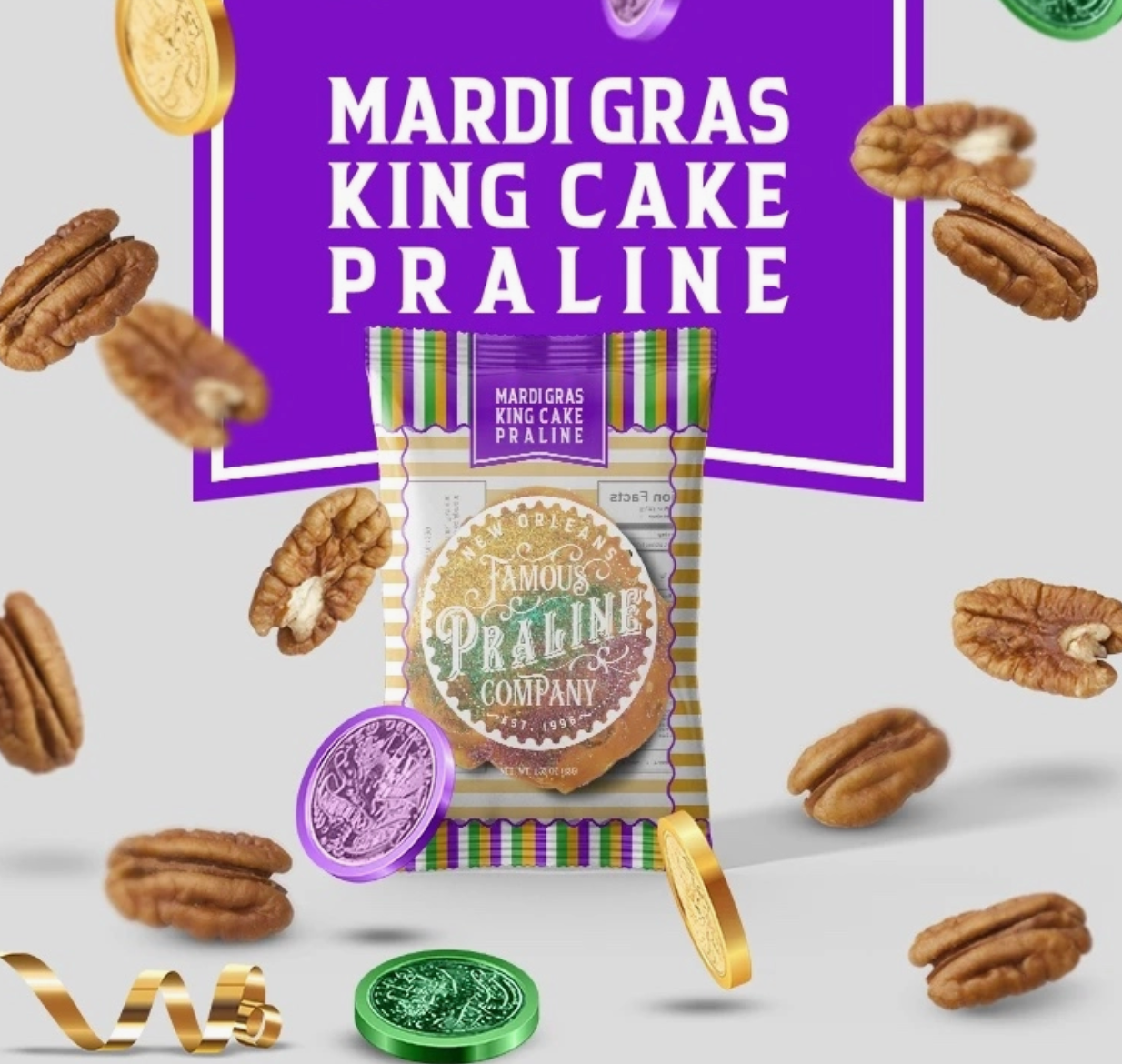 Individually Wrapped New Orleans Famous Mardi Gras King Cake Praline. The Mardi Gras King Cake Praline is a celebration in each bite! A classic 1.5 ounce Creole praline is sprinkled in Mardi Gras colors with purple, green, and gold sugar like a traditional New Orleans King Cake.