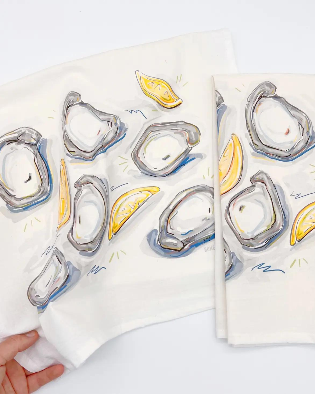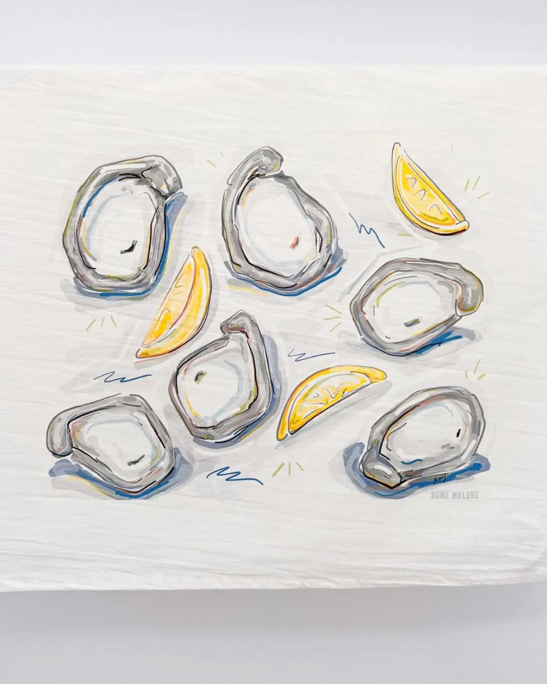 Add this beautifully illustrated and digitally printed Oyster Tea Towel from Home Malone. These absorbent flour sack towels are 100% cotton, measuring 18" wide x 28" long, and comes with a hanging loop in the top corner.