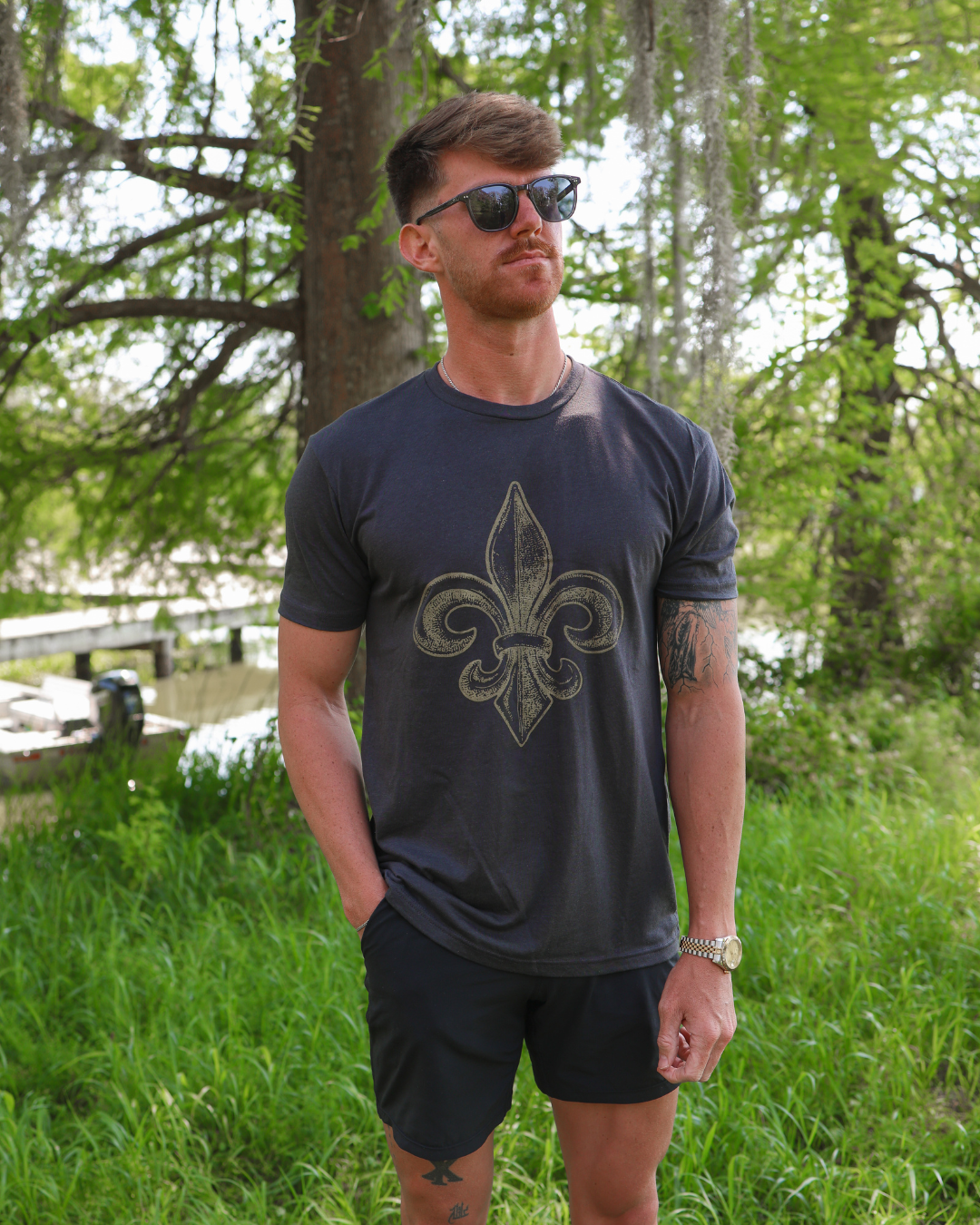 Looking for the perfect Louisiana souvenir or a comfy tee to show your local pride? Look no further than Sweet Baton Rouge's Fleur De Lis T-Shirt! This soft heather black tee features a iconic rustic fleur de lis design.