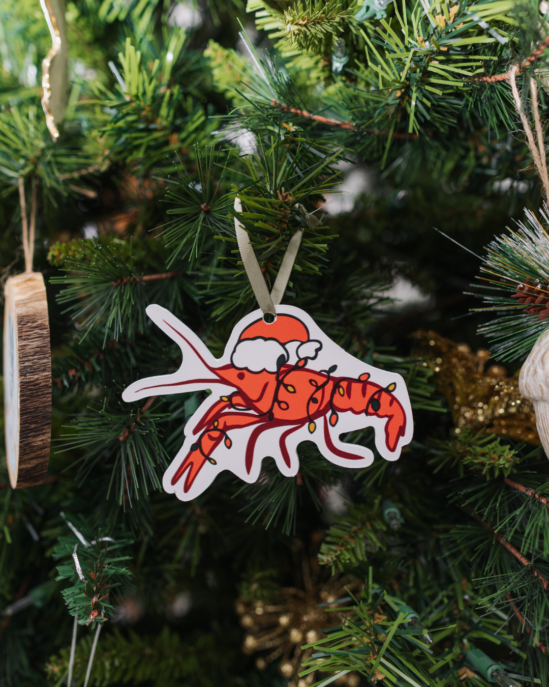 Enjoy the holidays with our one-of-a-kind Crawfish Santa PVC Ornament. This festive creation features a jolly Santa Claus crawfish dressed in traditional holiday attire & wrapped in Christmas lights. Made with high-quality PVC board & digitally printed locally in Baton Rouge, this ornament is a unique & meaningful addition to your Christmas tree. We worked with North Louisiana artist, Tiffany Clinton, to create this original design to pair with our Oh Crawfish Tree, showcasing our commitment to supporting local businesses!