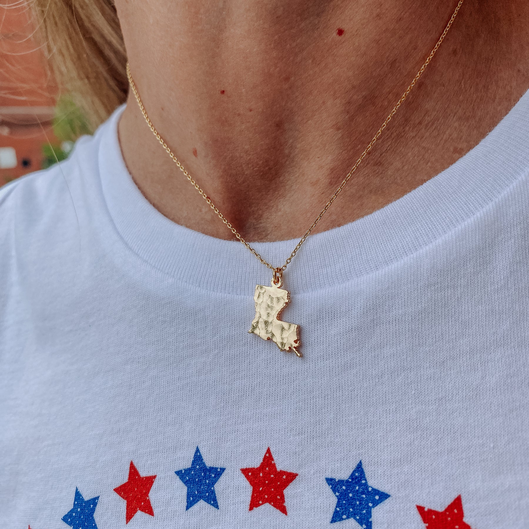Represent Louisiana with our custom Louisiana Necklace. The petite Louisiana Map in gold metallic coating accentuates the neckline to create a unique statement.